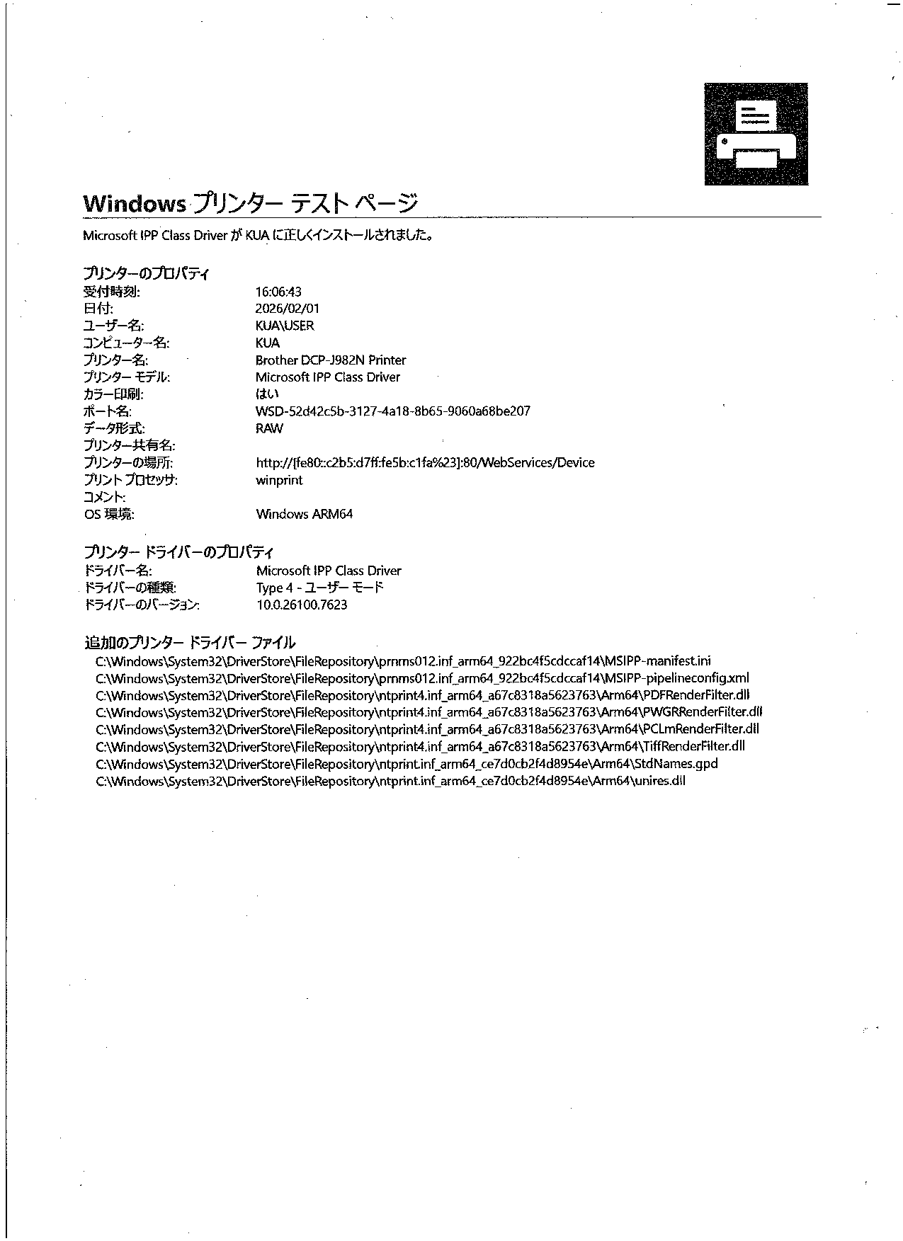 こちらは USB 接続にも関わらず Microsoft IPP Class Driver プリンタードライバーが使用されていました。